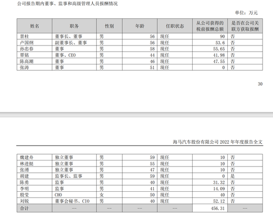 值得关注的是,海马汽车(4.640, -0.02, -0.43%)年报显示,报告期内董事、监事、高级管理人员报酬合计456.31万元。董事长、董事景柱从公司获得的税前报酬总额90万元,董事会秘书、CIO刘锐从公司获得的税前报酬总额52.12万元。