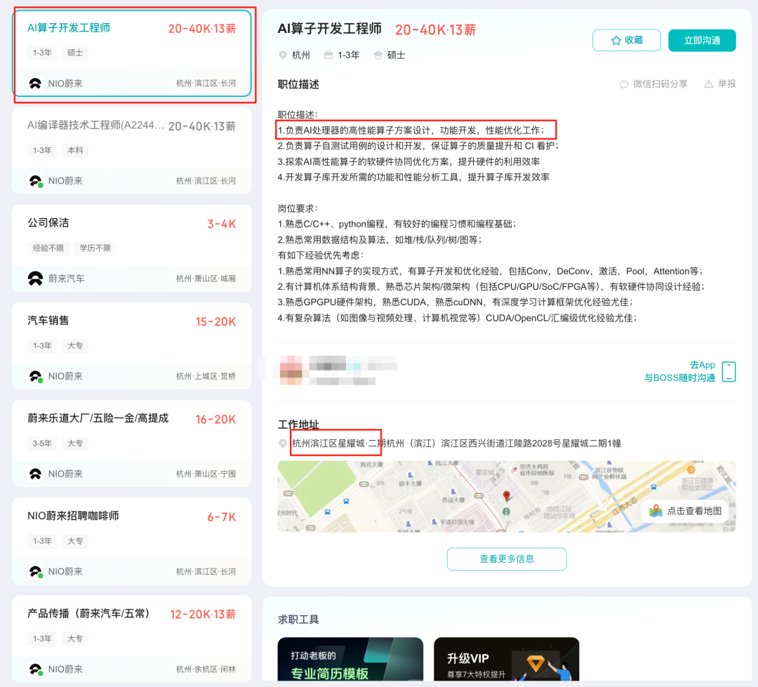 除了工商信息之外,蔚来的研发招聘需求,也有两个岗位指向了杭州滨江区。招聘网站的信息显示,蔚来已在滨江区开招AI编译器技术工程师和AI算子开发工程师,这在当地一众保洁、咖啡师和销售……岗位中显得尤为特殊。