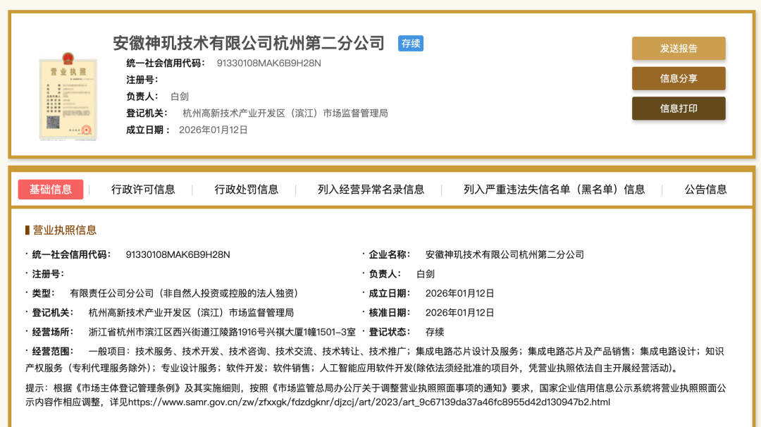 最新公开工商信息显示,蔚来全资芯片子公司安徽神玑,最近在杭州滨江区注册了第一、第二分公司,从事芯片设计和销售、软件开发和销售等业务。